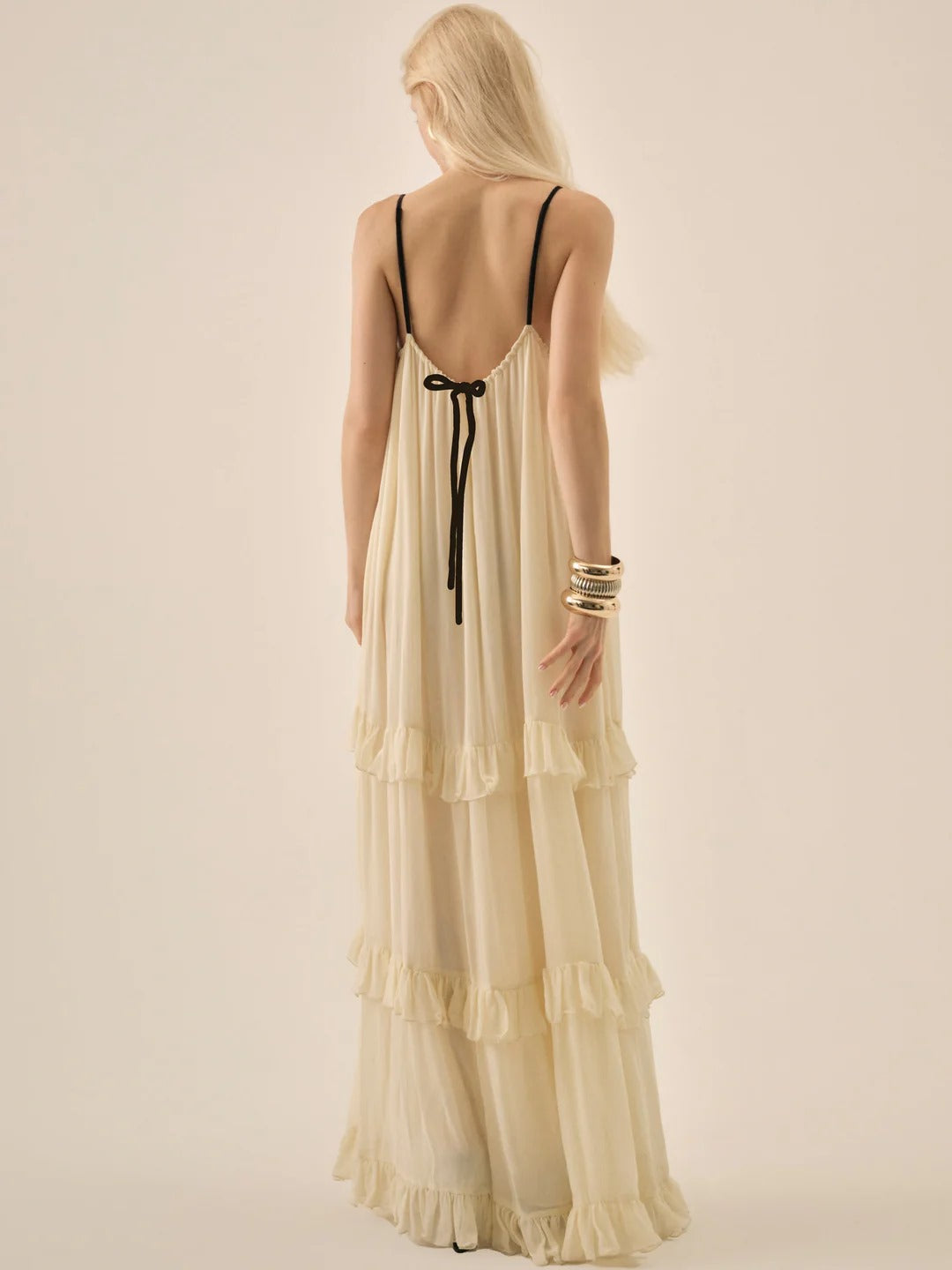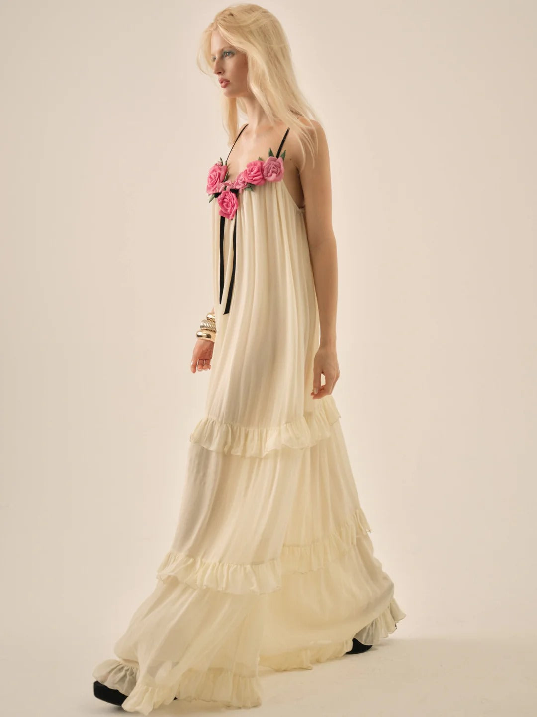 L’abito lungo crema For Love & Lemons con rose 3D è un capo romantico e raffinato, perfetto per eventi speciali. Le applicazioni floreali in rilievo impreziosiscono il décolleté, mentre le balze morbide donano movimento e femminilità a ogni passo. Le spalline nere sottili e la schiena scoperta aggiungono un tocco sensuale e moderno. Ideale per cerimonie, feste eleganti o look da red carpet, questo abito regala un’eleganza senza tempo.