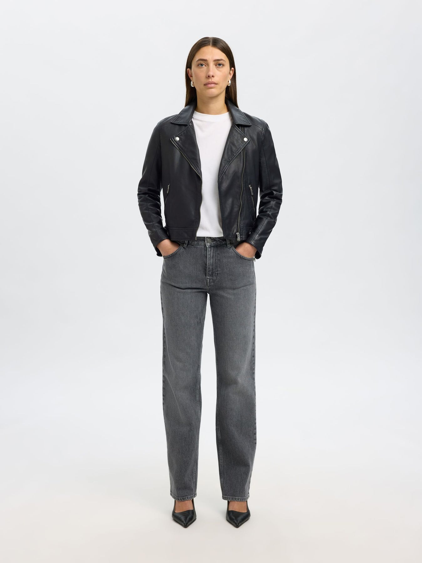 La giacca biker in pelle nera Selected Femme è un’icona senza tempo che unisce carattere e raffinatezza. Il taglio classico con zip asimmetrica e dettagli metallici conferisce un look rock-chic versatile, perfetto per completare sia outfit casual che serali con un tocco di personalità.